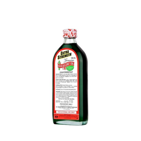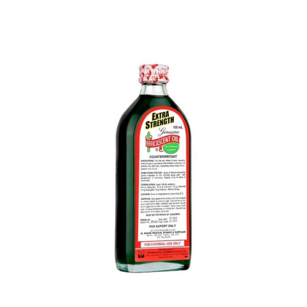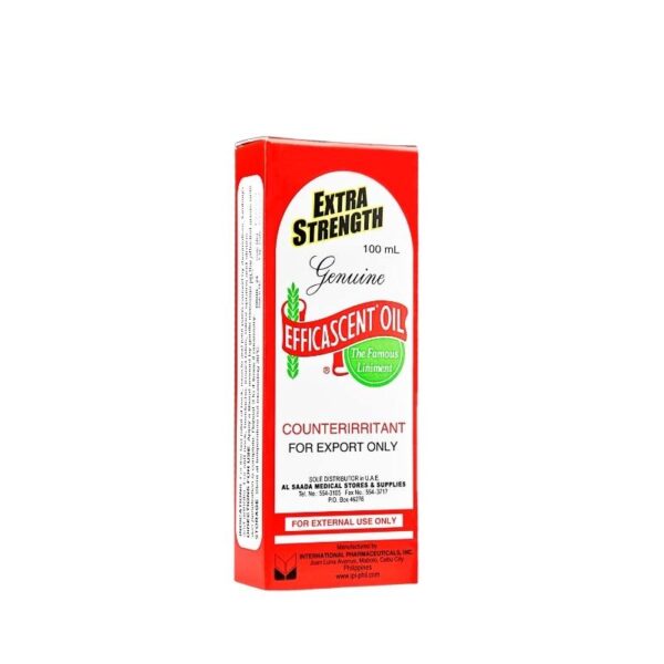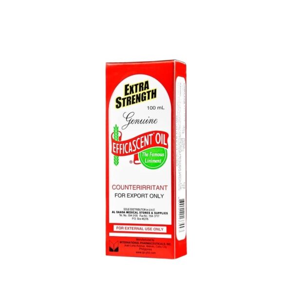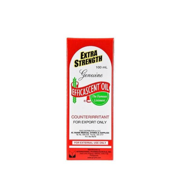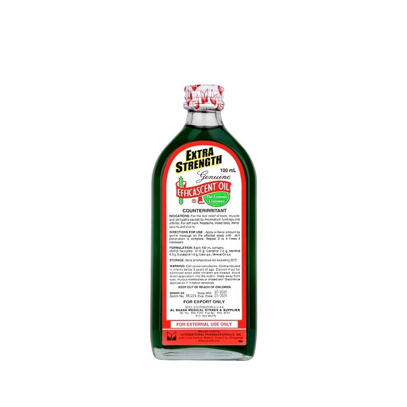 Efficascent Oil (Extra Strength) is a liniment especially formulated for fast and effective relief of rheumatism back pains, muscular pains, joint pains, lumbago, stiff neck, headache, flatulence, insect bites, minor sprains and strains, cramps, itchiness, and other skin irritations. This is the same trusted brand, but with a stronger formulation and deeper penetrating heat for faster relief of tedious muscles or body joints. Ideal for expectant mothers and little children for the relief of gas pains, headaches, itchiness, and minor burns.